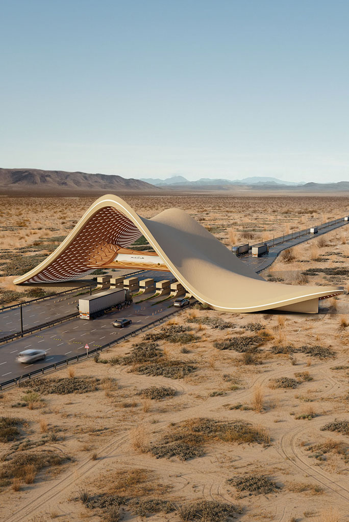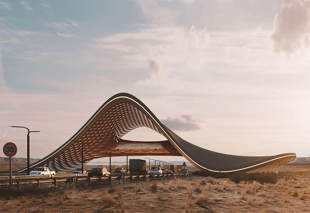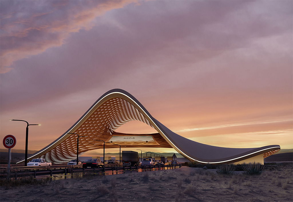 Functional: The design of the gateway is based on a vehicular and pedestrian access system that ensures smooth traffic flow while maintaining passenger safety. A wide canopy is provided for temporary stops and entry control without causing traffic congestion. Attention is given to auxiliary services such as informational signage, lighting, and urban wayfinding markers. The structure’s legibility as a city landmark is emphasized, conveying the identity of the entrance alongside its functional role.