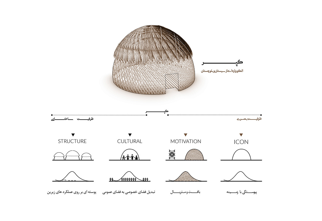 ارجاع به کپر بلوچ بهعنوان کهنالگو، پیوندی میان معماری بومی و طراحی معاصر ایجاد میکند.