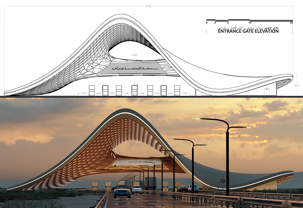 چابهار، سرزمین تلاقی دریا و کویر، همواره دروازهای رو به جهان بوده است؛ نقطهای که فرهنگ، تجارت و تمدن در آن به هم گره خوردهاند و نسیم اقیانوس، بوی تاریخ کهن ایران را با خود به همراه دارد. در طراحی دروازه ورودی این شهر، ما به سراغ کهنترین نماد معماری بومی آن رفتهایم، کپر؛ فرمی که قرنها مأوای مردم این سرزمین بوده و در عین سادگی، مظهر پیوند انسان با طبیعت و اقلیم است. کپر، همانند یک دروازه، سایه و پوشش میآفریند، مرزی میان بیرون و درون ترسیم میکند و بهعنوان نشانی از اجتماع و پیوند عمل میکند.