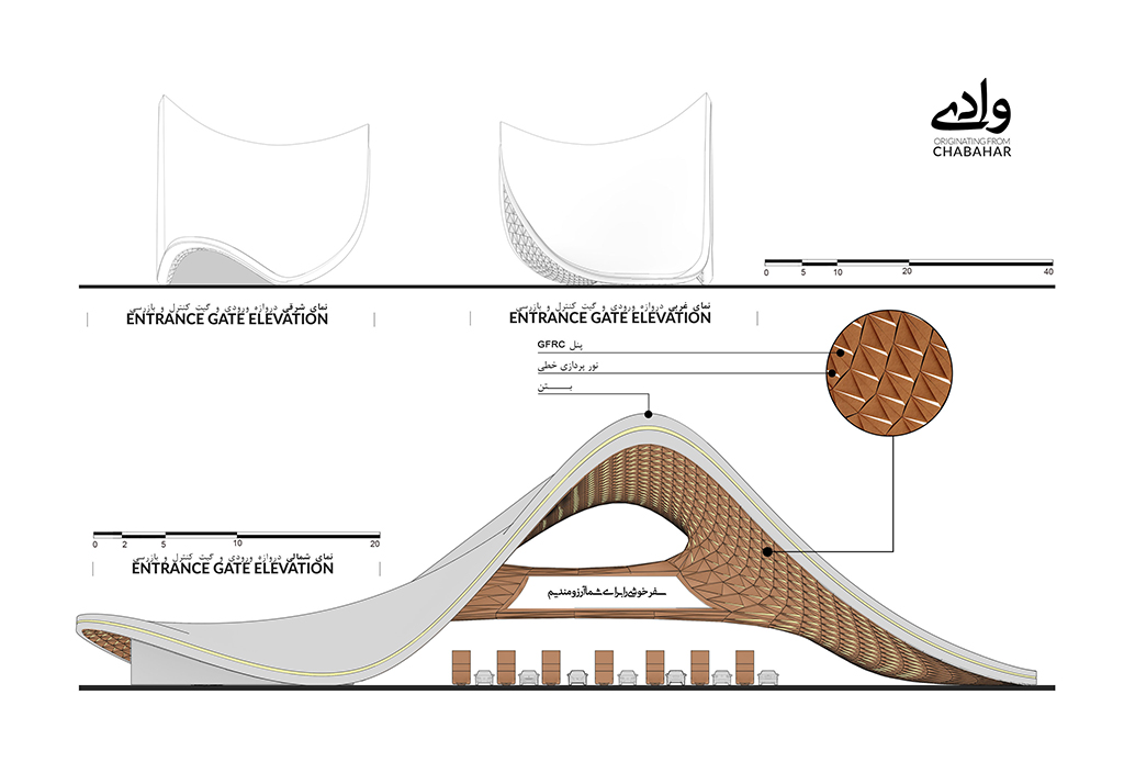 در مواجهه با مسأله طراحی دروازه ورودی، آن را نه صرفاً یک نشانه کالبدی، که آستانهای میان درون و برون یافتیم؛ دوگانهای از پوشش و گشودگی، از سرپناه و عبور. از همینرو بر آن شدیم تا با الهام از کپر بهعنوان کهنالگوی معماری بومی بلوچستان، سردر را از یک حجم منفعل به فضایی سیال و مفصلی پویا بدل کنیم؛ فضایی که ورود به شهر را از «عبور» به «تجربه» ارتقا دهد.