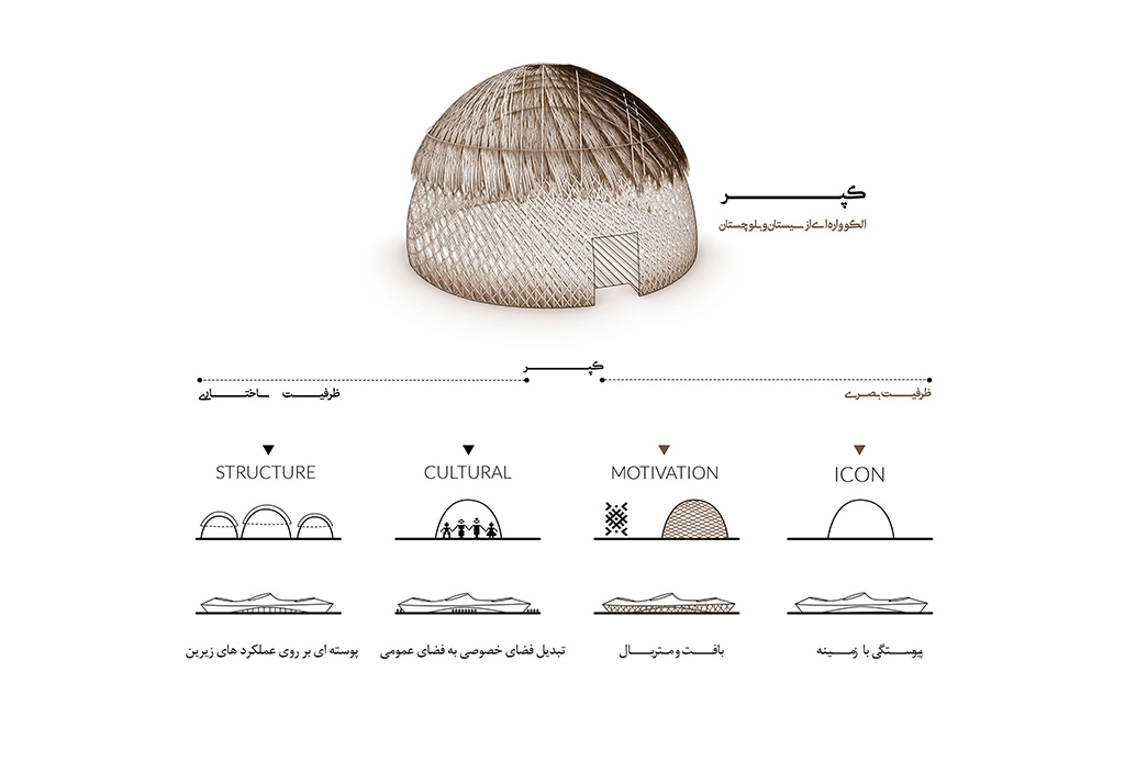 اگر دروازه شهر "عبور" را با نوعی تجربهگرایی به "حضور" تبدیل میکند، این اقامتگاه اما مجالی است برای افزایش کیفیت "حضور" و تبدیل آن به "خاطره". پروژه با الهام از هوشمندی معماری کوچنشینان سیستان و فرمهای ارگانیک تپههای شنی، به دنبال خلق یک "کاروانسرای معاصر" است. ایده اصلی، بازتعریف مفهوم "کپر"، "چادر" و "حیاط مرکزی" به عنوان کهنالگوهای سکونت در منطقه است، جایی که مسافر امروزی نه تنها اتراق میکند، بلکه در فضایی غوطهور در فرهنگ و اقلیم، "تجربه سکونت" میکند.