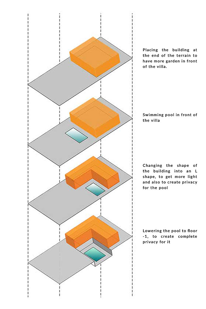 The design of the project was entrusted to another company, but due to the employer's dissatisfaction with the previous work plans, it was introduced to our office. The site was located in one of the towns around Kordan, and one of the client's wishes in the design was to create a suitable swimming pool and as much green space as possible on the site. Our overall design strategy was to optimize the placement of the villa while concurrently enhancing the dimensions of the front garden. So that, the pool would be placed in front of the villa. We considered the volume of the villa as an L shape to provide more light to the interior spaces and to create privacy for the pool in front of it. But the pool still did not have the necessary privacy. So it was relocated to a lower floor and provides maximum privacy for the pool and the underground space that was left unused was transformed into a cozy space with a different spatial quality. Next to the swimming pool, an all-glass space was designed for playing billiards and fire sometimes to warm up the gathering on the cold winter nights, it’s also a peaceful place where you can see the sky. In this way, the movement began at the start of the garden and went past some stone fireplaces, over a suspension bridge, and ended up at the entrance.