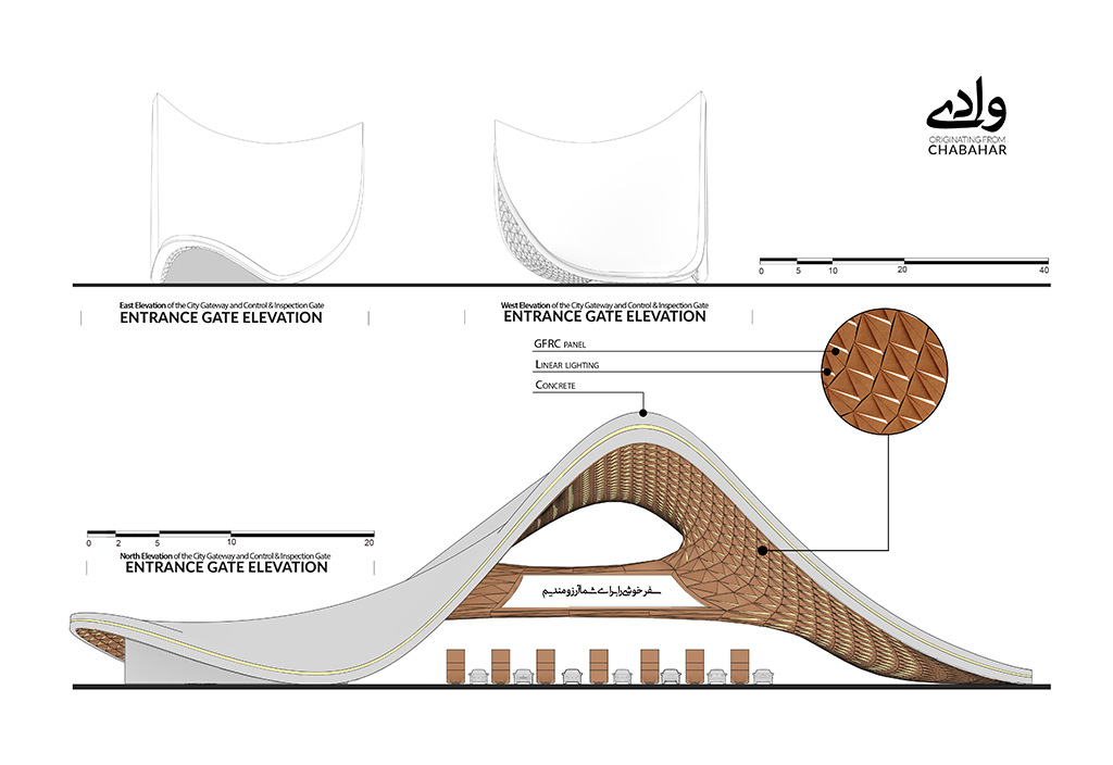 Referencing the Baluch kapar as an archetype creates a connection between vernacular architecture and contemporary design. The reflection of local handicrafts and woven patterns in the structure emphasizes the region’s cultural and indigenous identity. Attention to Iranian architectural language through proportionality and repetition of motifs is evident. The gateway serves not only a functional urban role but also a symbolic one, representing the local culture.