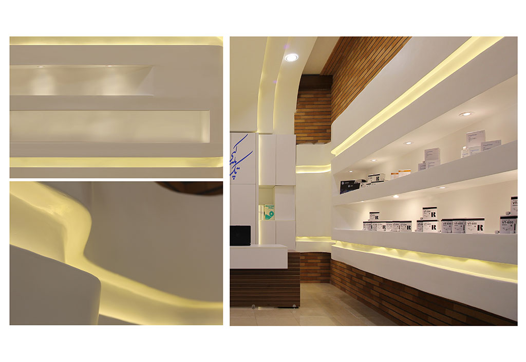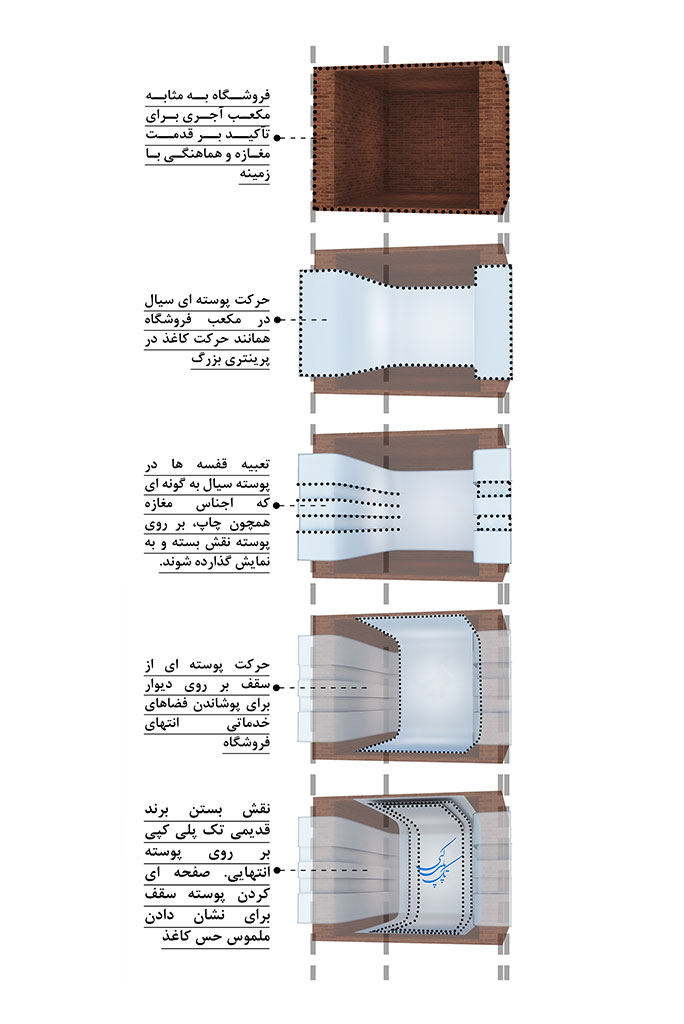 فرآیند طراحی: ابتدا کالبد فروشگاه را به صورت یک مکعب آجری در نظر گرفتیم تا نشان دهندۀ قدمت فروشگاه بوده و با زمینۀ موجود همخوانی داشته باشد. سپس با توجه به کوچک بودن ابعاد فروشگاه، تصمیم گرفتیم برای دعوت کنندگی بیشتر، ویترین را حذف کنیم. همچنین با بررسی دستگاههای کپی و پرینت و نحوه حرکت کاغذ در آنها، صفحه ای پیوسته در نظر گرفتیم که از روی نما شروع شده، به داخل فروشگاه کشیده میشود و از سمت دیگر فروشگاه دوباره بر روی نما ادامه می یابد. با این ایده فروشگاه به دستگاه پرینتر بزرگی تبدیل شد که اجناسش را بر روی کاغذ بزرگی به چاپ رسانده و نمایش میدهد. همچنین بر اثر حرکت نمادین کاغذ، کنج هایی منحنی بوجود آمد، که به لحاظ فرمی با عناصر موجود در نماهای دوران پهلوی اول و دوم در خیابان انقلاب هماهنگ بود. از طرف دیگر برای مخفی کردن فضاهای خدماتی و انبار در انتهای فروشگاه و ایجاد پیوستگی بیشتر بین سقف و دیوار، صفحه دیگری از روی سقف به روی فضاهای خدماتی کشیده شد و به این ترتیب فضای انتهایی به عملکرد انبار و شستشو اختصاص داده شد که در کمدهایی مخفی شدند.