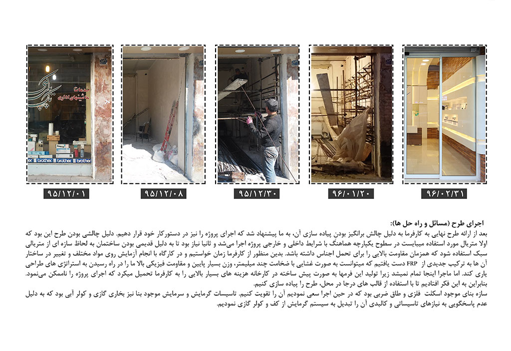 اجرای طرح: نکتۀ حائز اهمیت در اجرای این پروژه این بود که اولاً متریال مورد استفاده میبایست در سطوحی یکپارچه اجرا میشد و ثانیاً نیاز بود تا به دلیل قدیمی بودن فروشگاه به لحاظ سازه ای از متریالی سبک استفاده شود که مقاومت بالایی برای تحمل وزن اجناس را نیز داشته باشد.